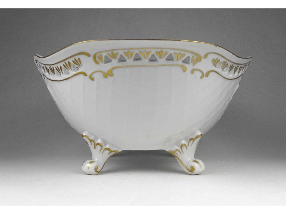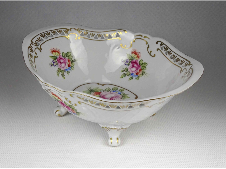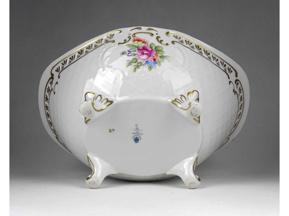 Hibátlan állapotú, jelzett, virágcsokor mintás, aranyozott peremű, áttört szélű, négy lábon álló, ovális alakú Hollóházi porcelán dísztál, kínáló tál, asztalközép kínáló.