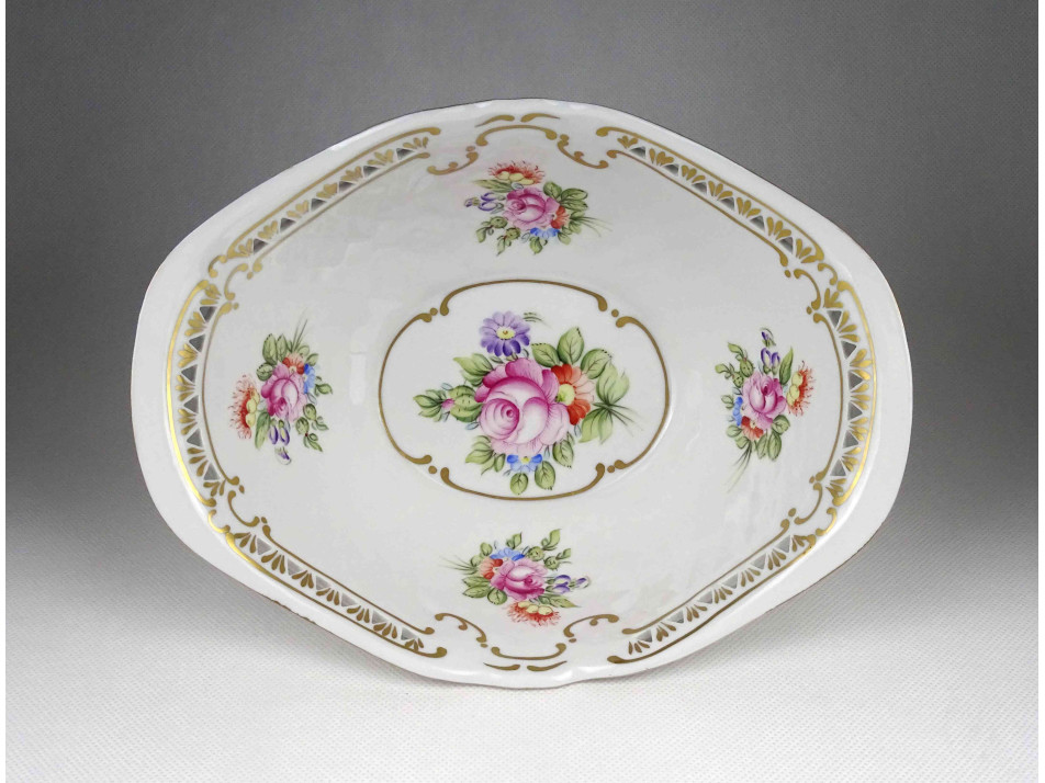 Virágcsokor mintás áttört szélű ovális Hollóházi porcelán lábas dísztál 24.5 x 19 cm