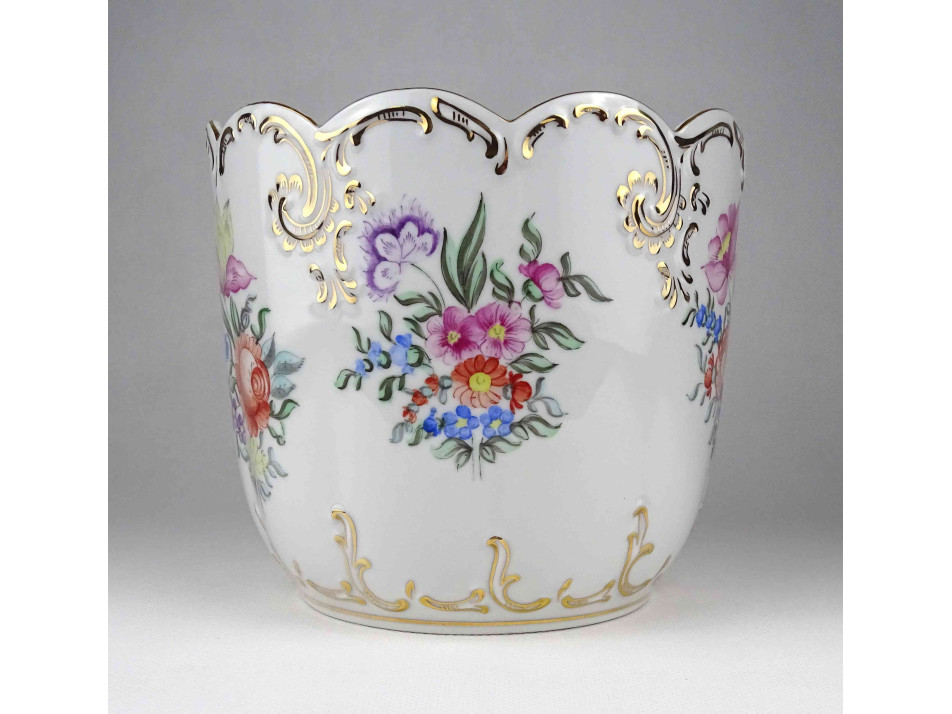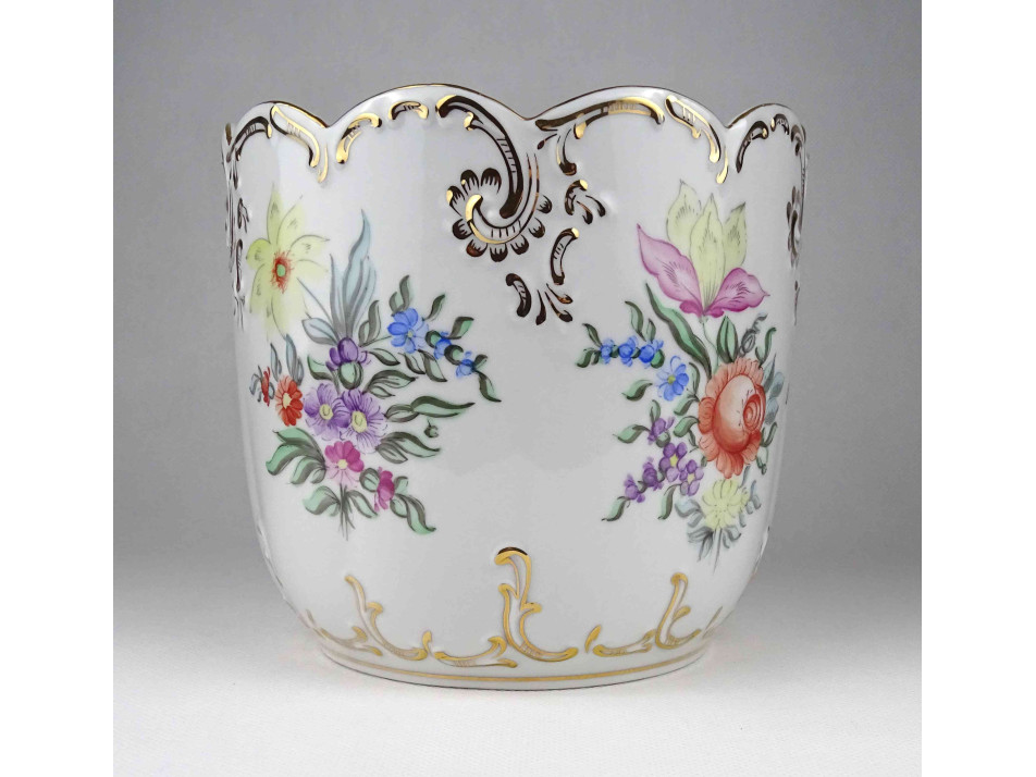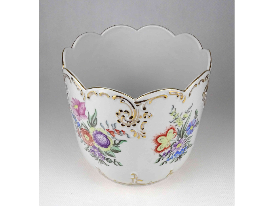 Hibátlan állapotú, nagyméretű, barokkos formavilágú, gazdagon aranyozott, kézzel festett virágmintás, jelzett Hollóházi porcelán kaspó.