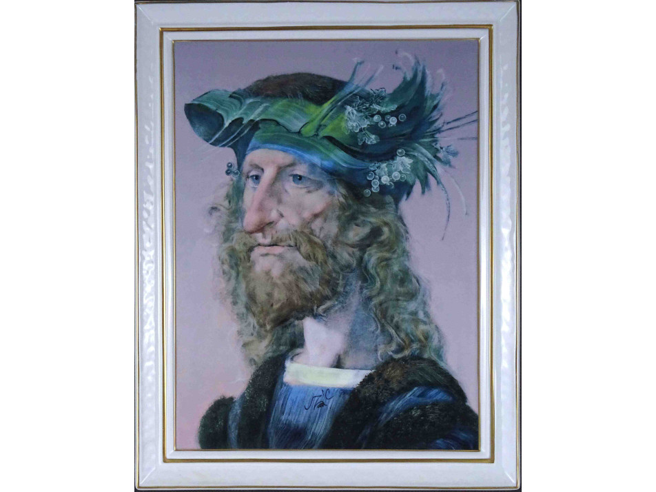 Hibátlan állapotú, valódi arannyal aranyozott, szakállas férfi portrét ábrázoló, Szász Endre hollóházi porcelán falikép. Falra akasztási lehetőséggel rendelkezik.