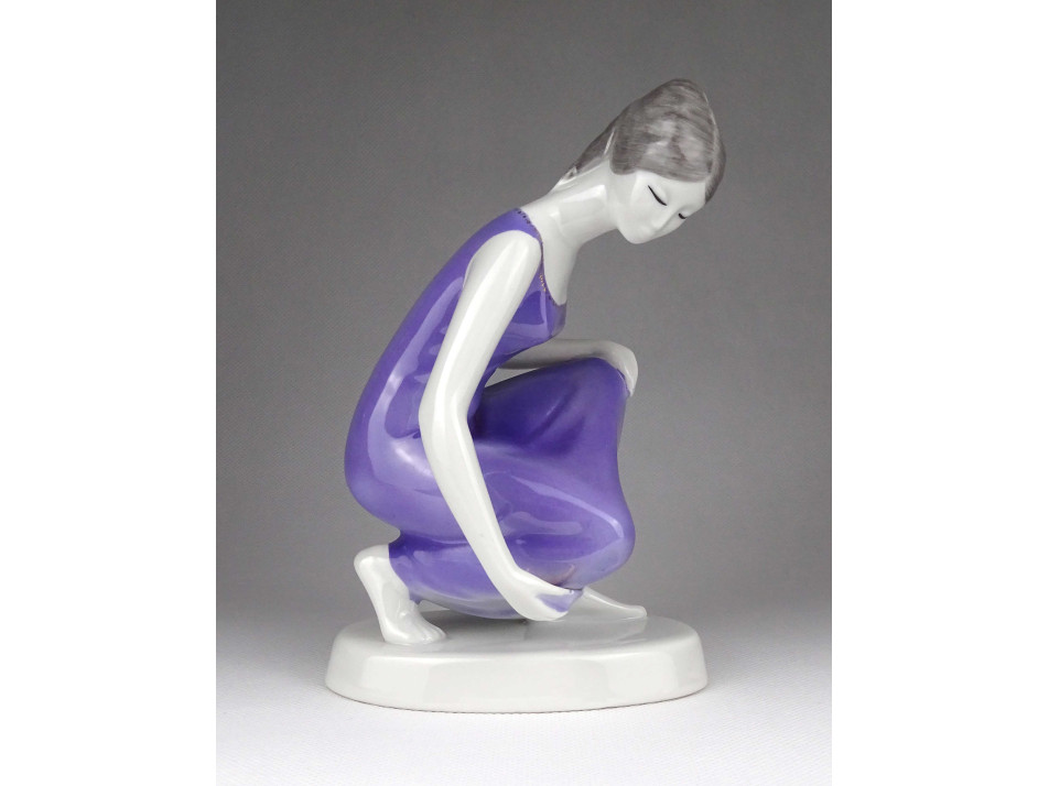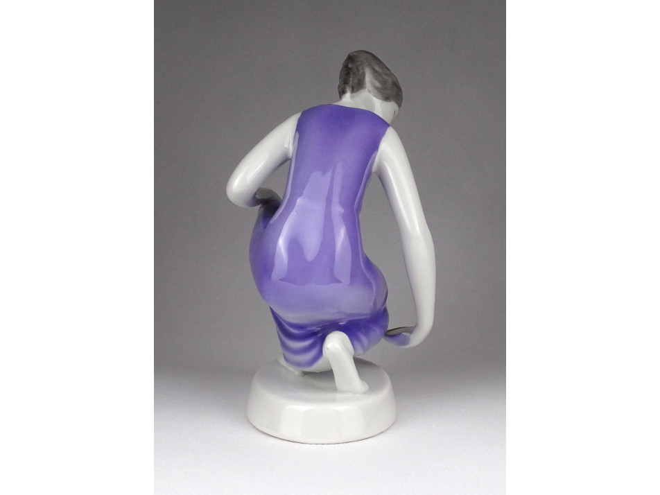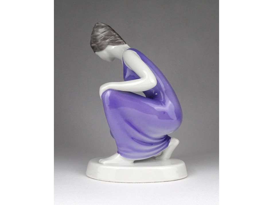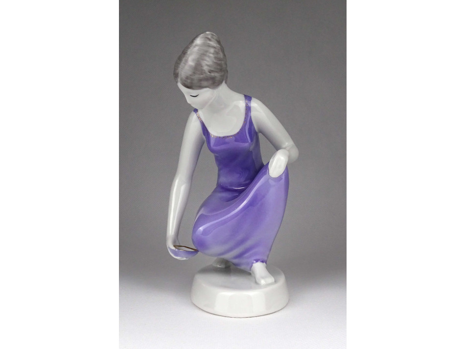 Hollóházi porcelán lila ruhás vízmerítő nő szobor