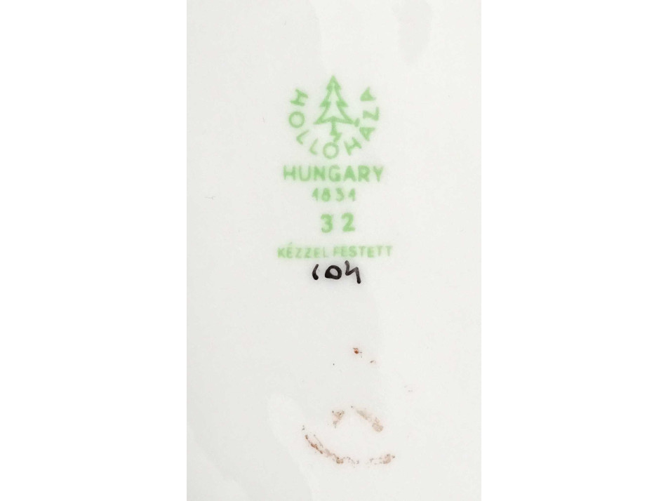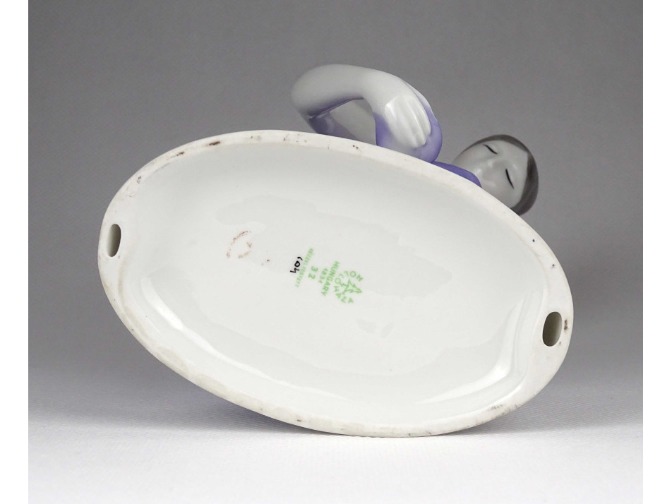 Hibátlan állapotú, jelzett, talapzaton álló, lila ruhás nő Hollóházi porcelán szobor, kezében tálkával.