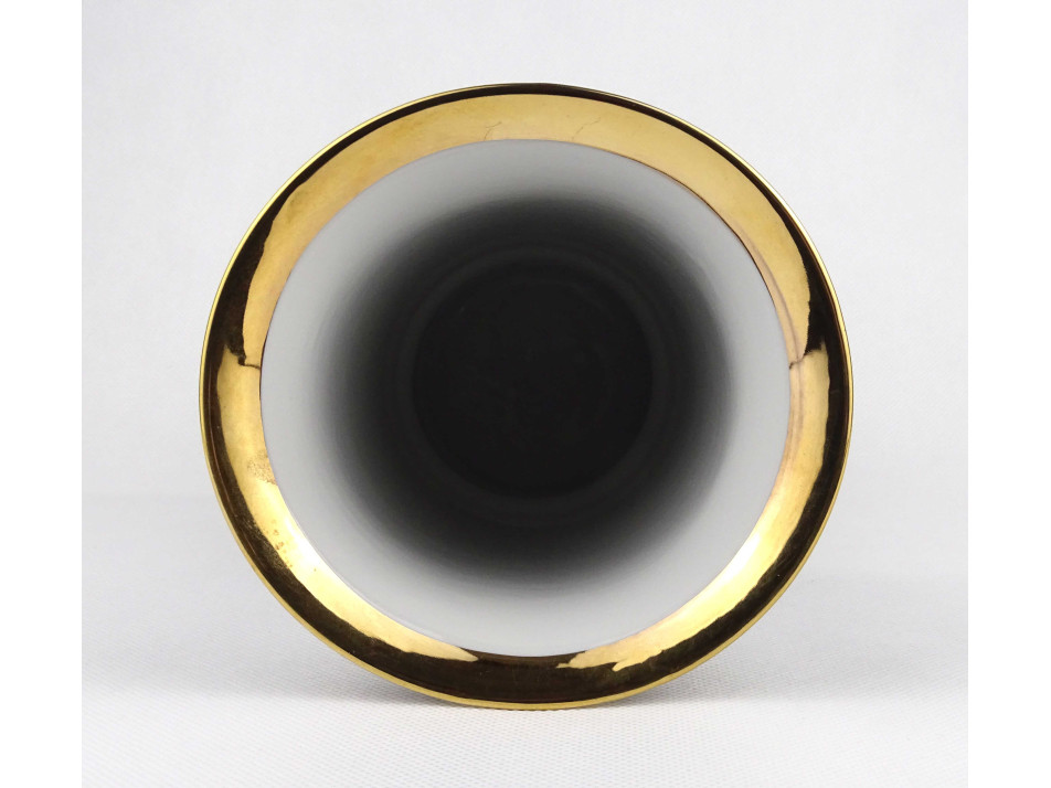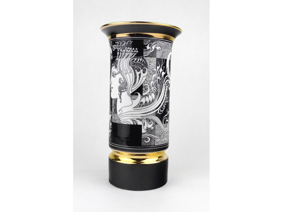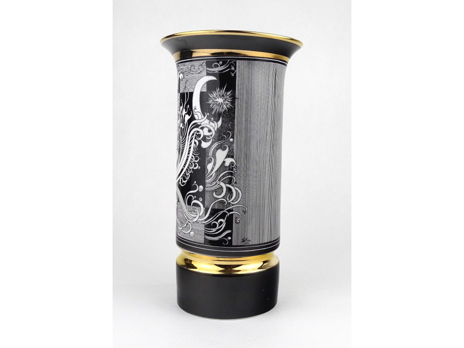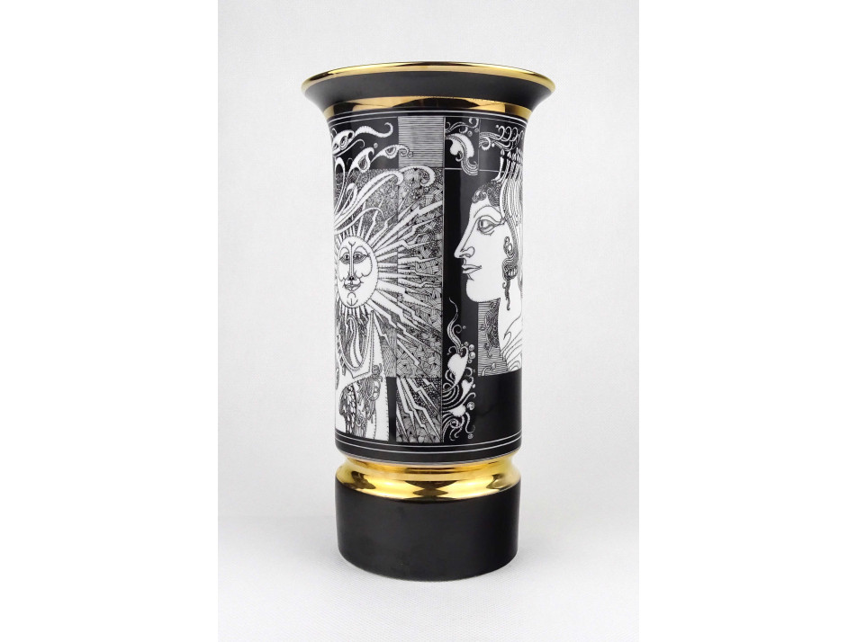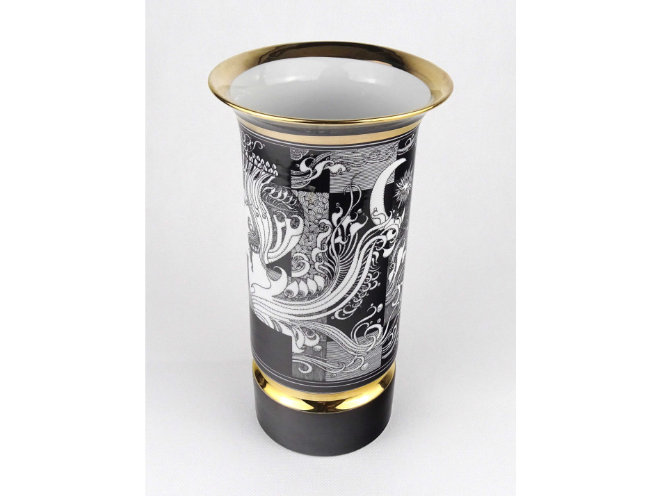 Hibátlan állapotú, vastagon aranyozott, nagy méretű Hollóházi porcelán váza. Oldalán körben Szász Endre által készített "Napfény" motívum látható.
