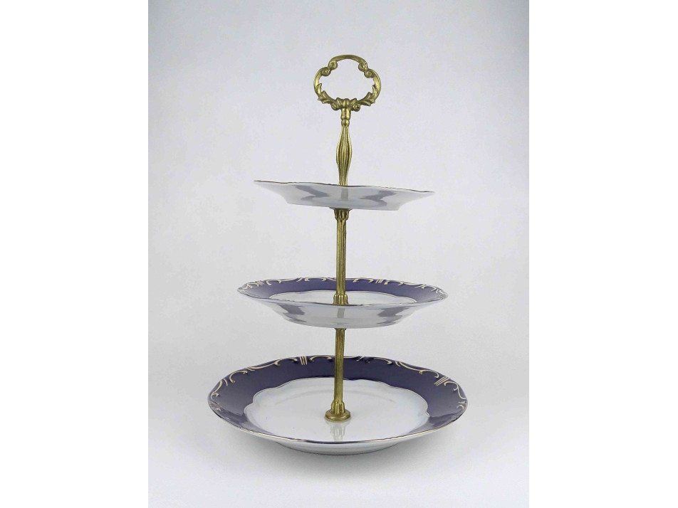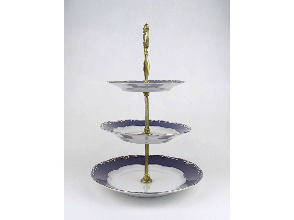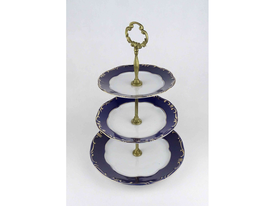 Hibátlan állapotú, Zsolnay Pompadour porcelán emeletes kínáló tál, kék szegéllyel, gazdagon aranyozva.