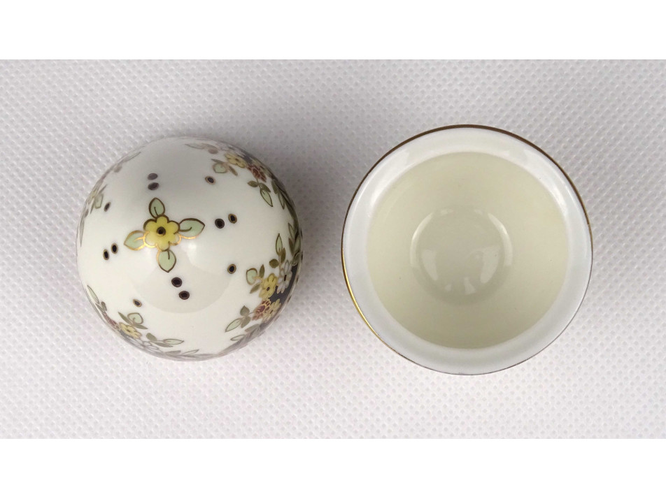Hibátlan állapotú, vajszínű, álló tojás alakú, különleges Sissy mintás Zsolnay porcelán gyűrűtartó, ékszertartó bonbonier.