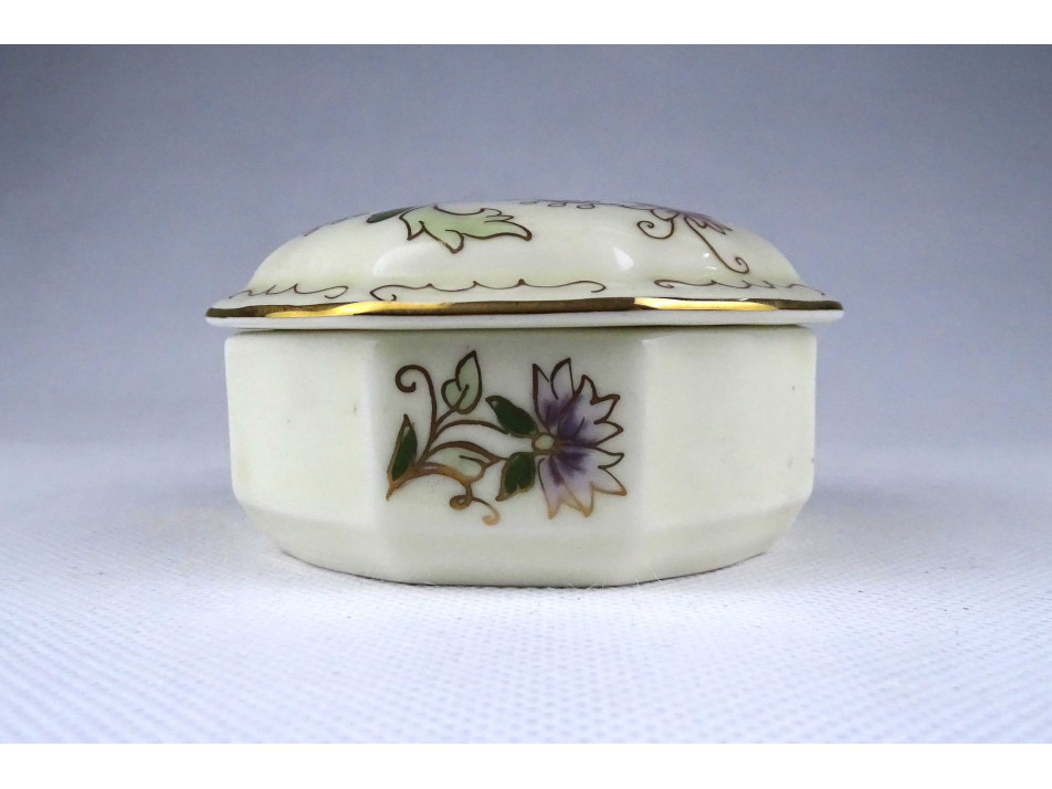 Vajszínű virágmintás nyolcszögletű Zsolnay porcelán bonbonier 9 cm