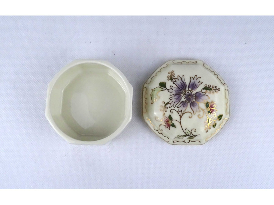 Nyolcszög alakú, hibátlan állapotú, lila virágmintás, vajszínű Zsolnay porcelán bonbonier.