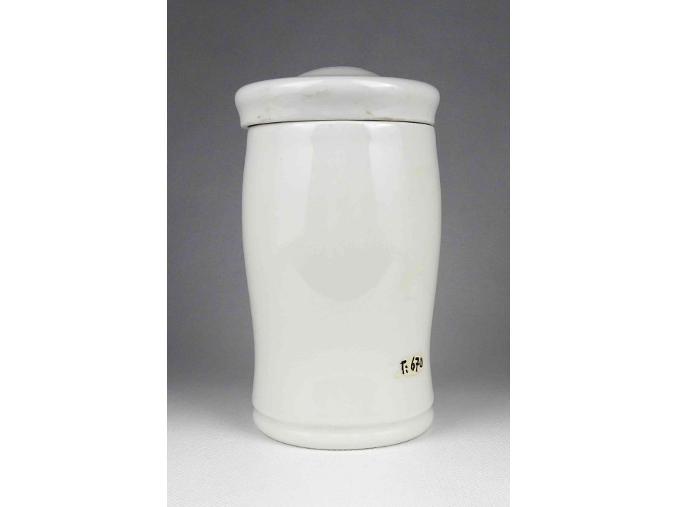 Hibátlan állapotú, nagyméretű gyógyszertári patika edény, tároló. Vastagfalú Zsolnay porcelán tégely, porcelán fedéllel.