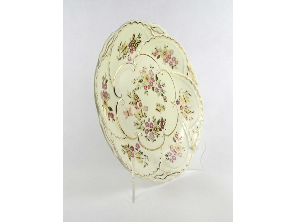 Nagy méretű, hibátlan, gazdagon aranyozott vajszínű Zsolnay porcelán tál, fali tál. Akasztási lehetőséggel rendelkezik. Kézzel festett lepke és virág motívumokkal díszített.