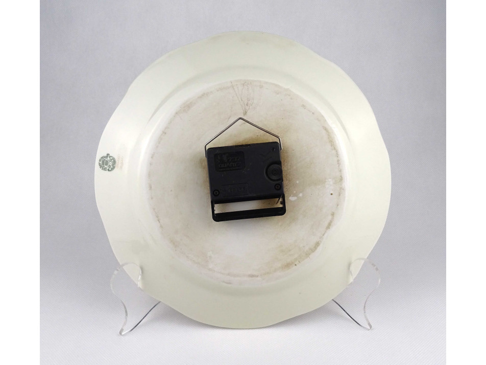 Hibátlan állapotú, dúsan aranyozott, kézi festéssel díszített római szám beosztású, rézmutatós működő, vajszínű pillangós porcelán falitányér, óra.