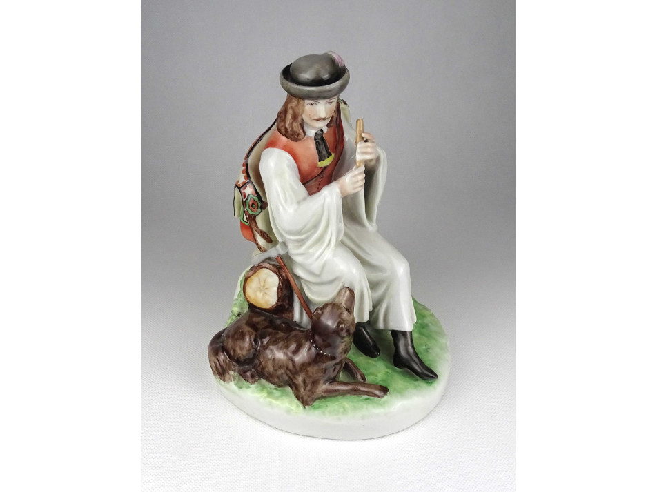 Régi, hibátlan állapotú, Zsolnay - Izsó porcelán figura, kutyájának furulyázó legény tollas kalapban.