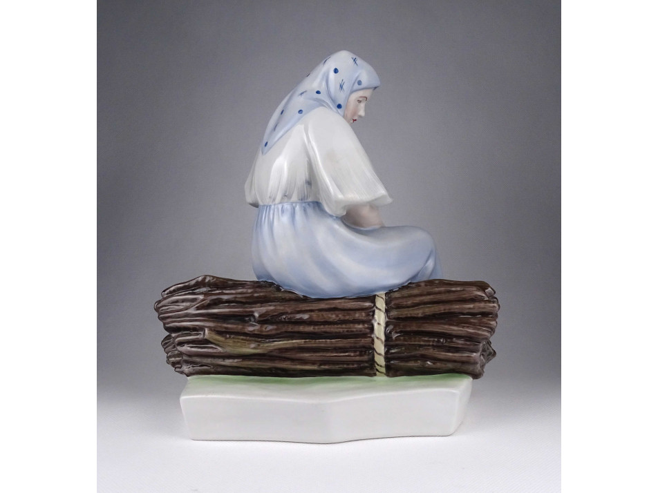 Régi, hibátlan állapotú, nagyméretű, kézi festéssel díszített rőzsekötegen ülő asszonyt ábrázoló Zsolnay porcelán szobor.