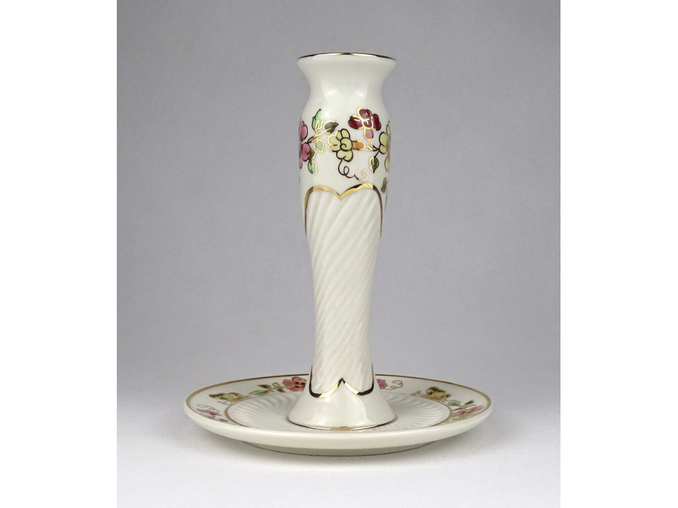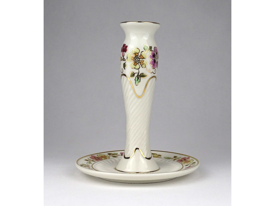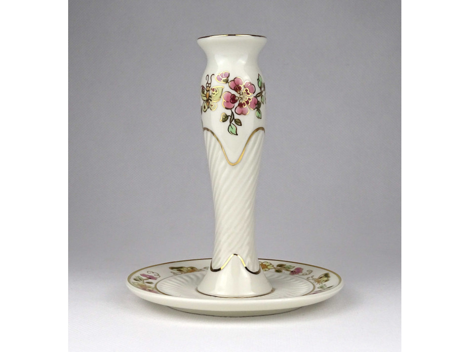 Hibátlan állapotú, vajszínű, aranyozással gazdagon díszített, pillangós, virágmintás, talpas gyertyatartó.