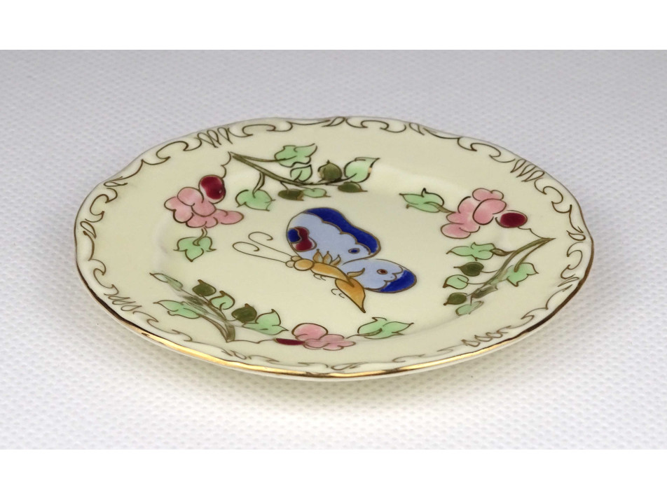 Hibátlan állapotú, gazdagon aranyozott, virágmintákkal és kék pillangóval díszített vajszínű Zsolnay porcelán kistányér.