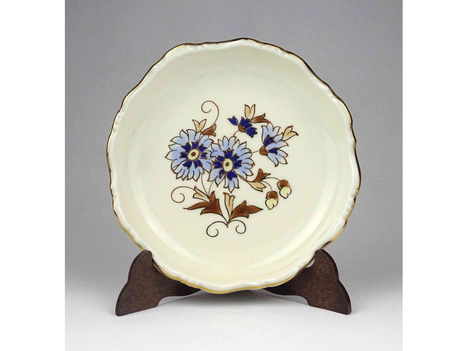 Hibátlan állapotú, vajszínű, kék búzavirág díszes Zsolnay porcelán hamutál, hamutartó, peremén körben aranyozással.
