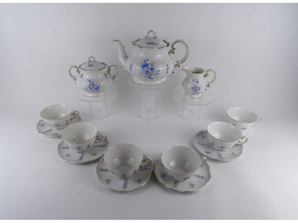 Régi, hibátlan állapotú, 5 személyes apró kék virágmintás, búzavirágos Zsolnay porcelán teáskészlet. 14 darab. A kistányérok aranyozása kopottas.