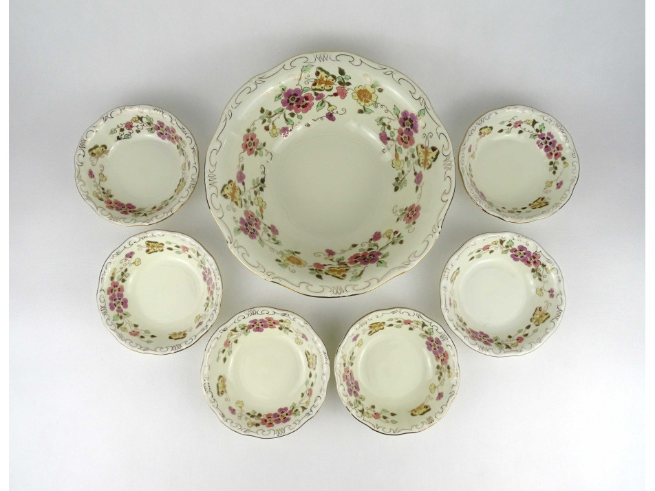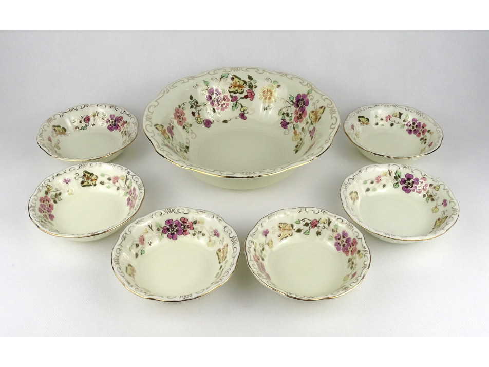 Pillangó mintás vajszínű Zsolnay kompótos készlet 6+1 darab