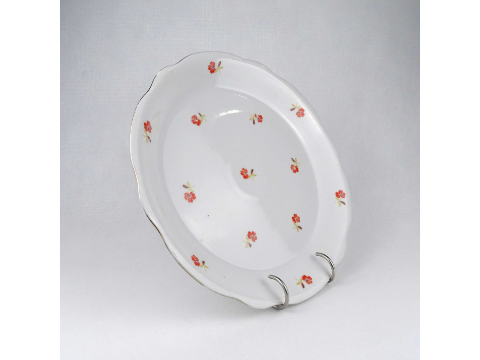 Régi, kerek, aranyozott szélű, apró virágmintás porcelán süteményes tál, kínáló tál, tortatál. Szélén egy apró, valószínűleg a gyártás során keletkezett sérülés látható. Lásd fotó.