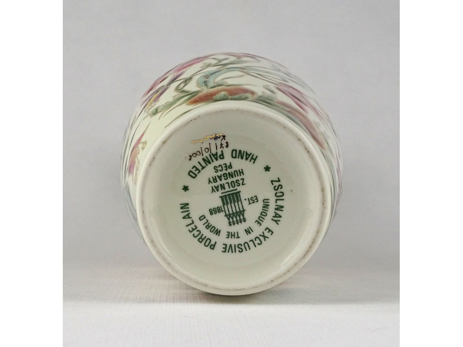 Hibátlan állapotú, újszerű, jelzett, vajszínű, gyönyörű kézi festésű orchidea díszítéses, gazdagon aranyozott Zsolnay vajszínű porcelán váza.