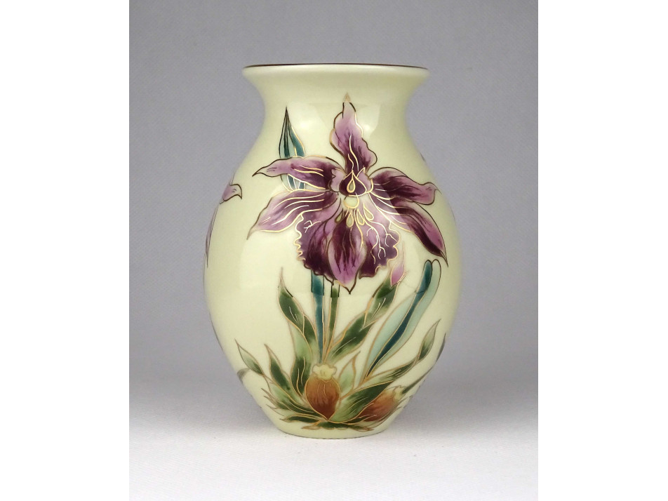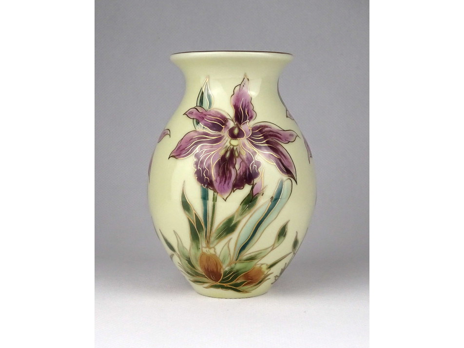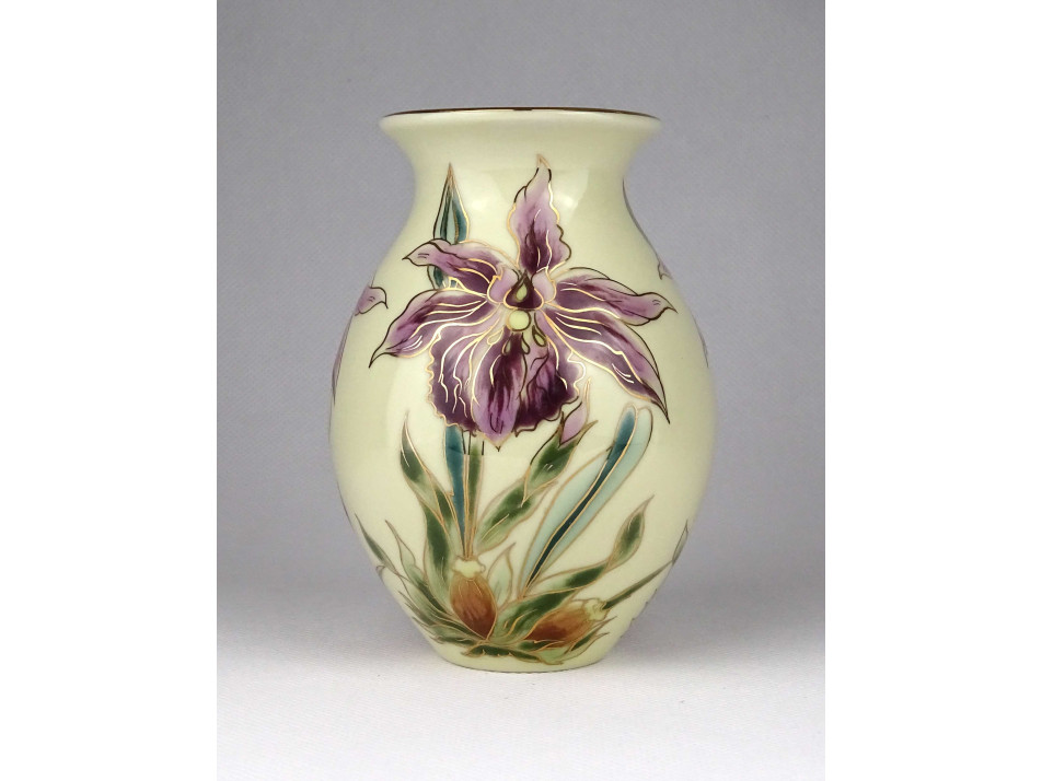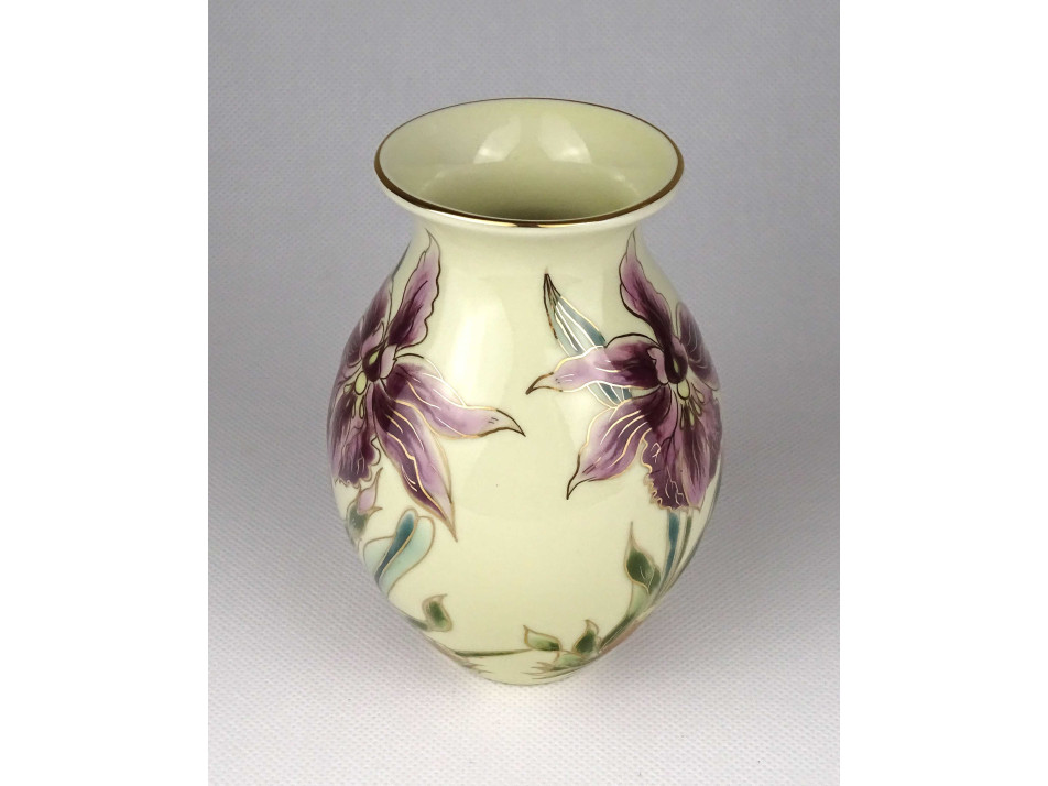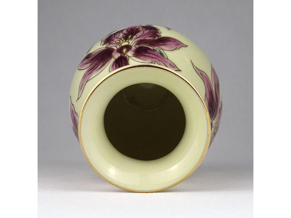 Vajszínű, orchideás Zsolnay porcelán díszváza 13 cm