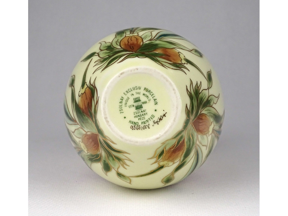 Hibátlan állapotú, vajszínű, virágmintás, aranyozott Zsolnay porcelán dísz váza, orchidea mintás díszítéssel.