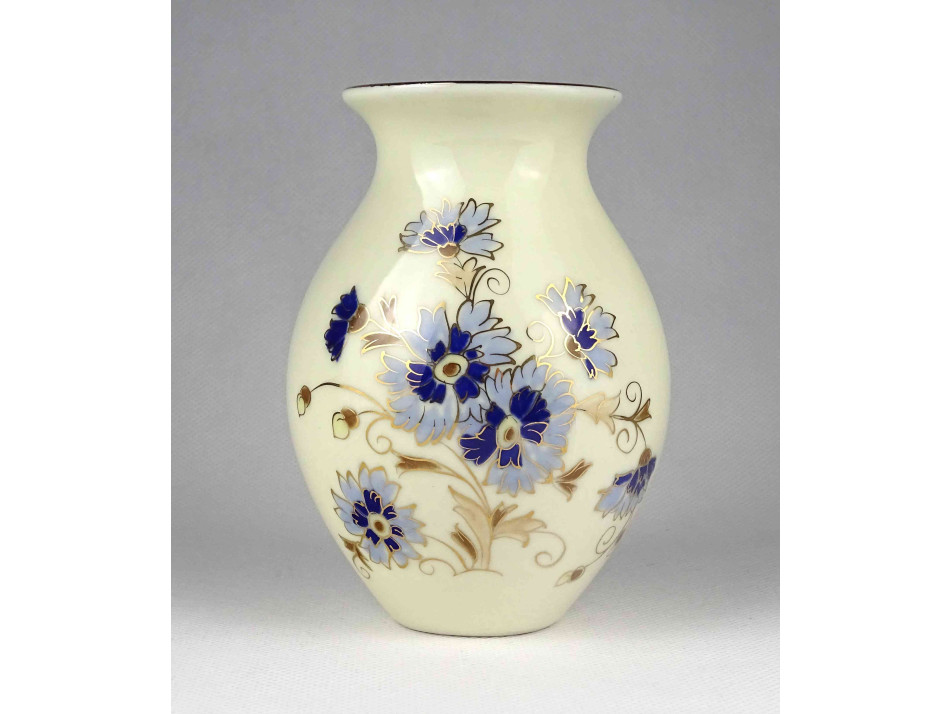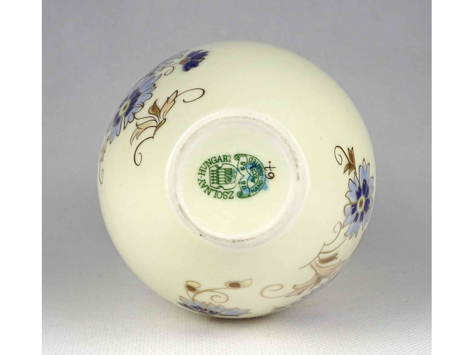 Hibátlan állapotú, vajszínű aranyozott Zsolnay porcelán díszváza búzavirág mintás díszítéssel. A mázat a váza teljes felületén apró repedések borítják.