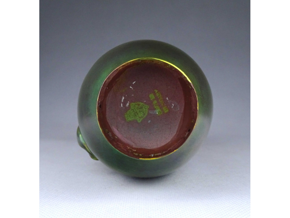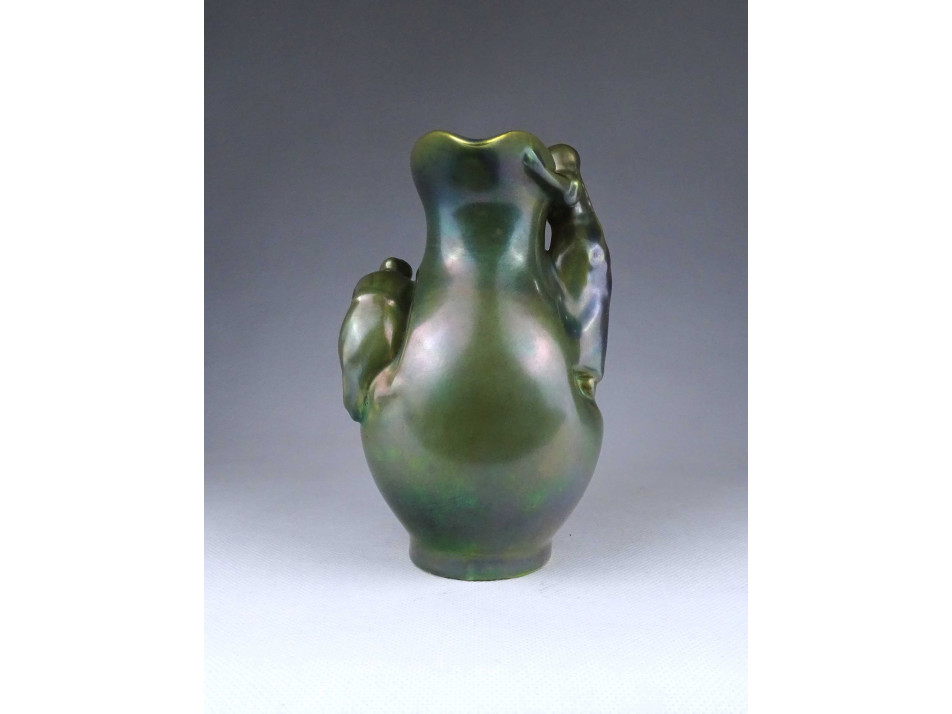 Régi, hibátlan állapotú, zöld eozin mázas Zsolnay porcelán kancsó alakú váza. Oldalán két plasztikus nőalakkal.