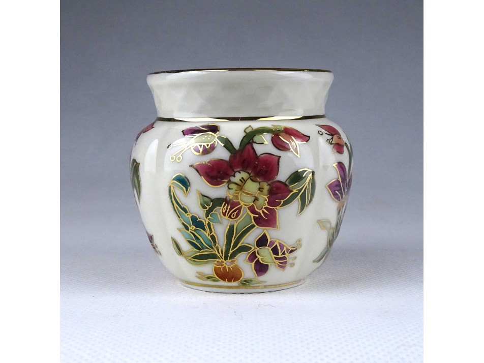 Vajszínű aranyozott orchidea mintás Zsolnay porcelán váza kis kaspó 6.7 cm