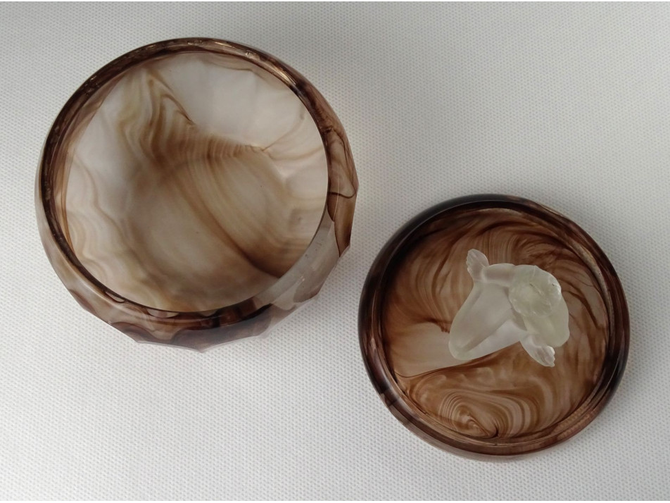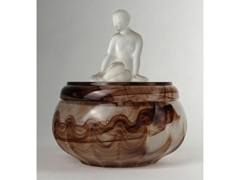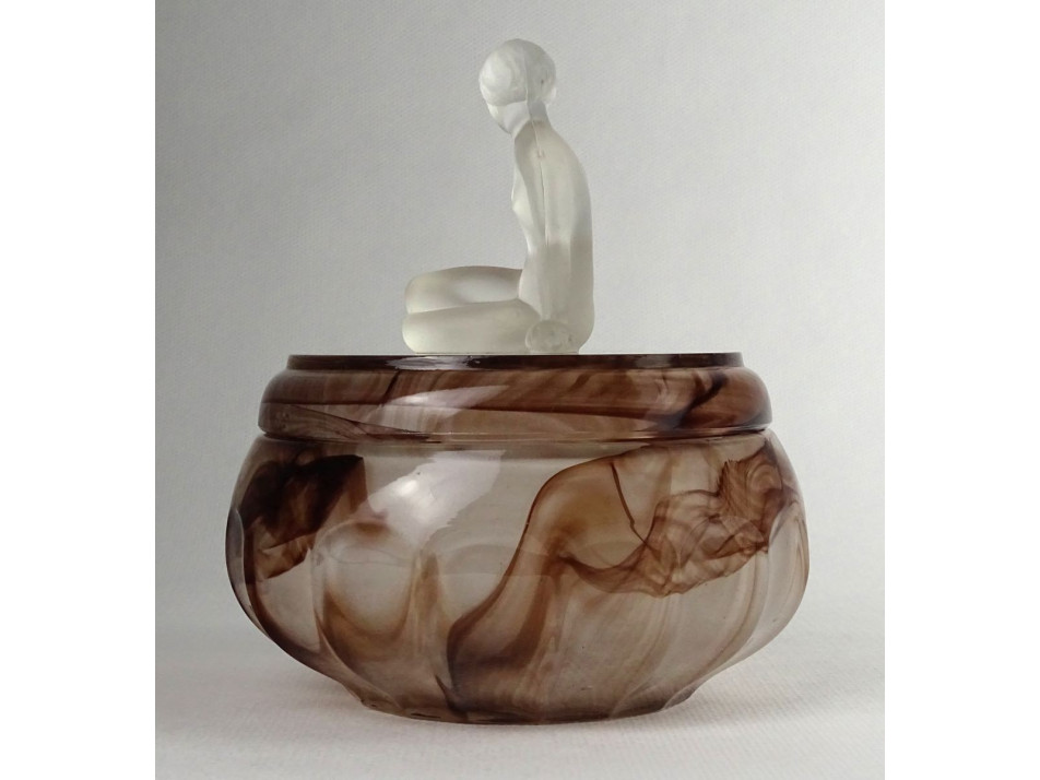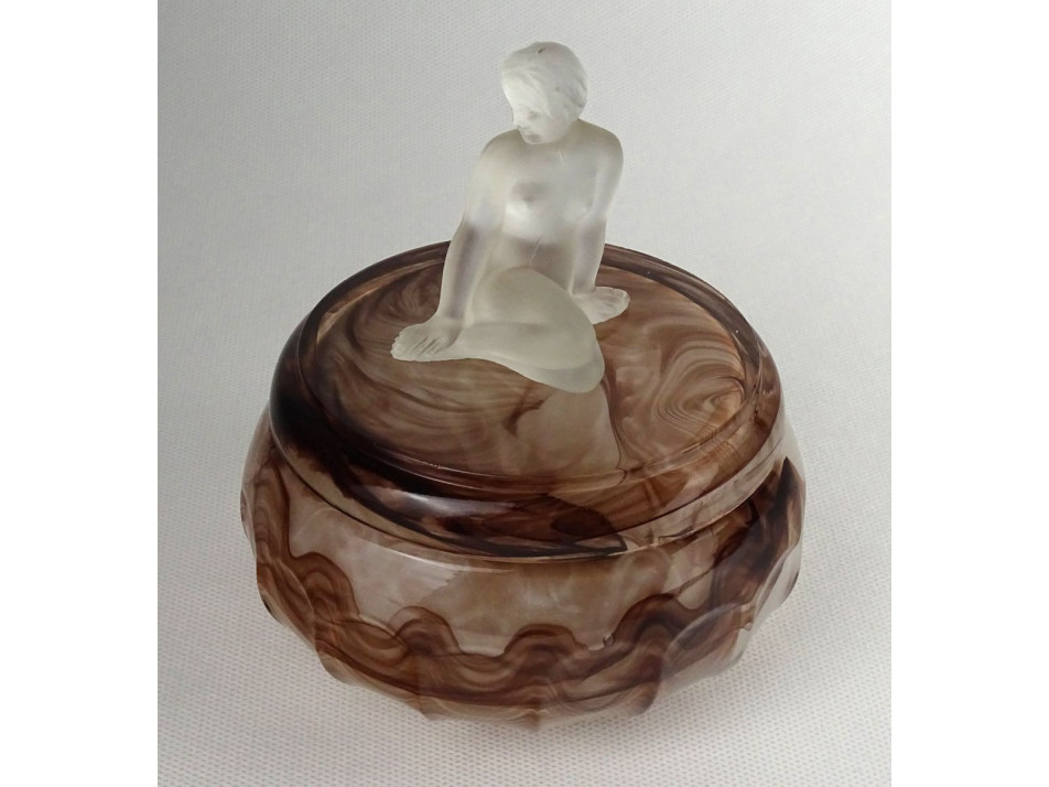 Régi, szép állapotú üveg szelence, üveg bonbonier. Tetején ülő női akt üveg szobor. A tető belső felén apró sérülés található, lásd fotó.