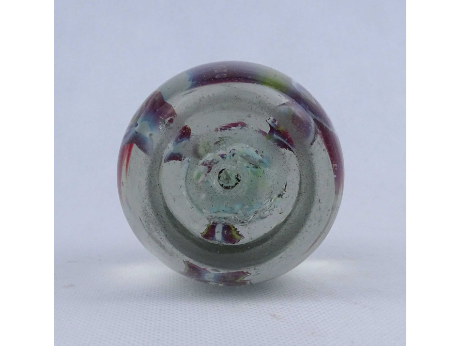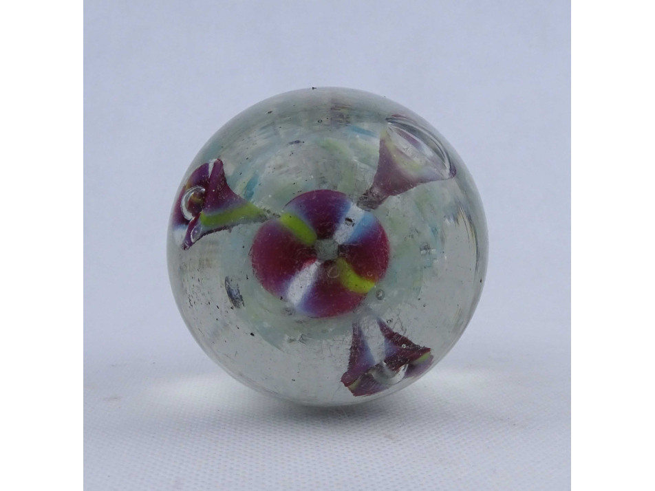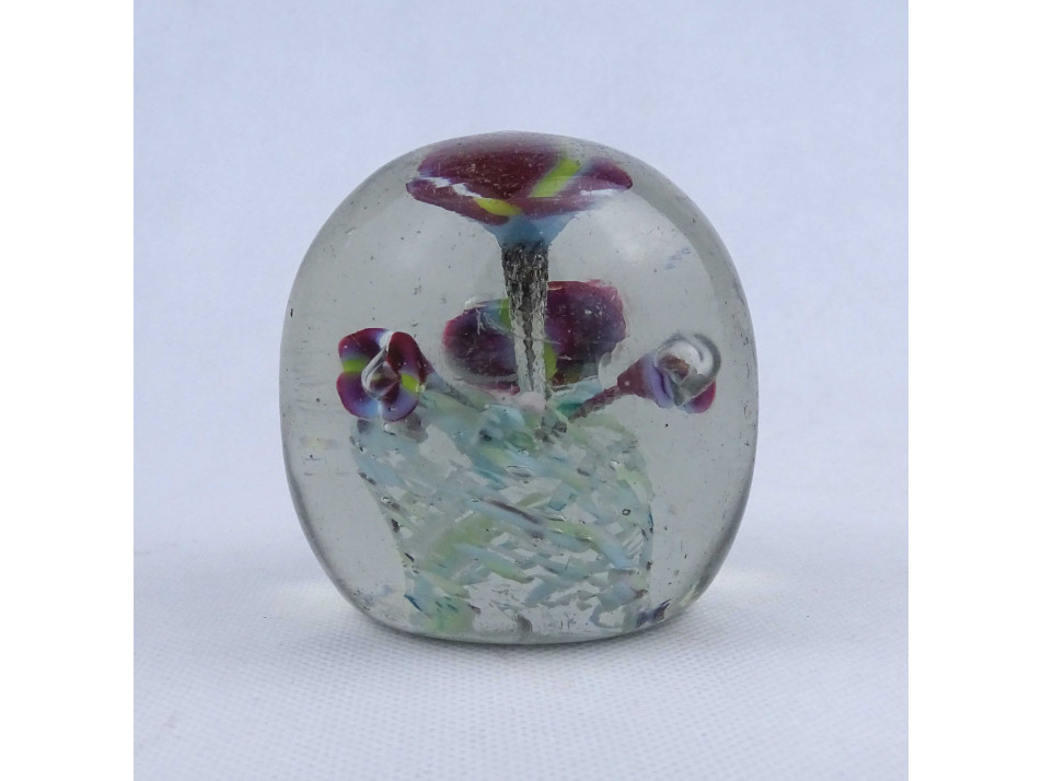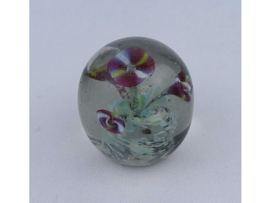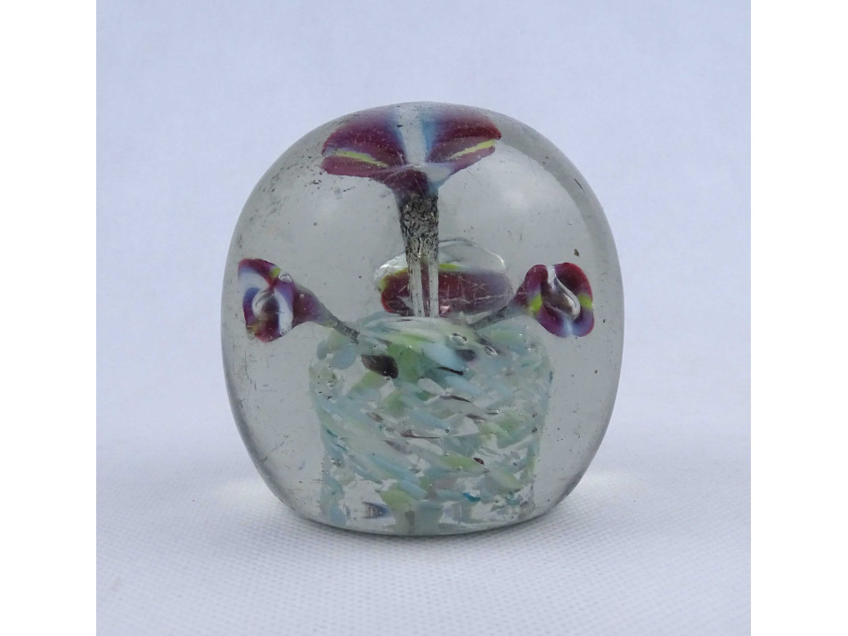 Antik, szép állapotú gömb alakú fújtüveg íróasztali kellék, üveg levélnehezék, belsejében négy darab plasztikus színes virággal. Alján látható a fújás és szakítás nyoma. A levélnehezék teteje a sok apró karctól elhomályosult.