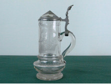 Rózsaszín, anyagában színezett, elegáns talpas fújt üveg likőrös készlet. Az egyik pohár száján és egy másik talpa peremén apró lepattanás található. Lásd fotó.