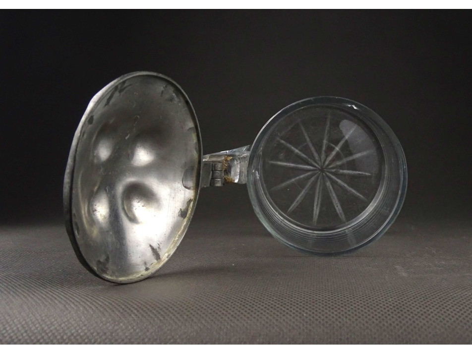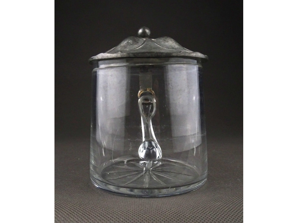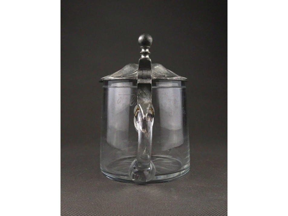 Antik, szép állapotú, ón fedeles, mércézett fújtüveg sörös korsó. Talpán csiszolt díszítés, amellyel a fújás, szakítás nyomát tüntették el. Felső peremén néhány apró lepattanás található.