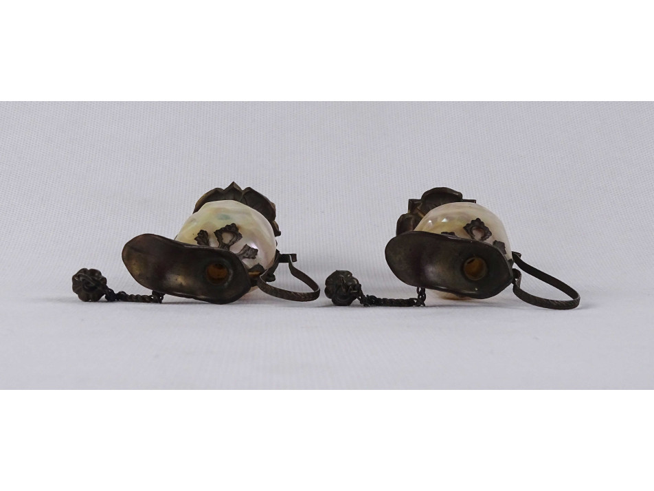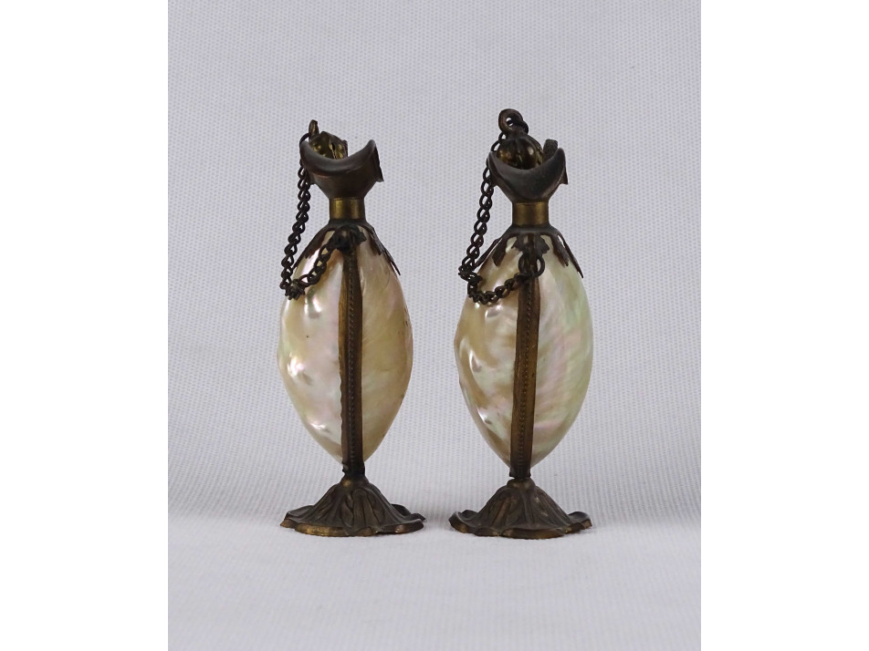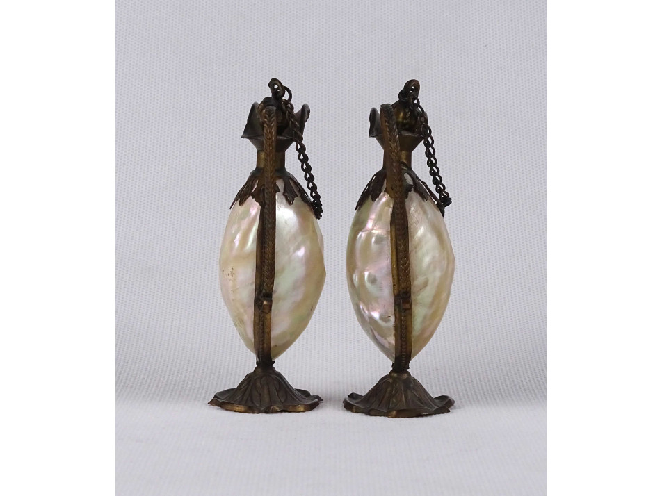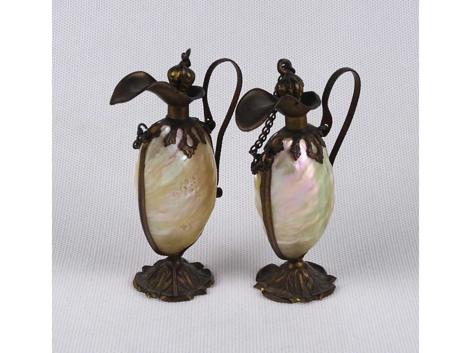 Régi kisméretű olajos ecetes kiöntő pár. Különleges kialakítású, a gyöngyházból készült testet préselt lemezrátét foglalat tartja egyben. Dísztárgy, valódi használatra nem alkalmas.