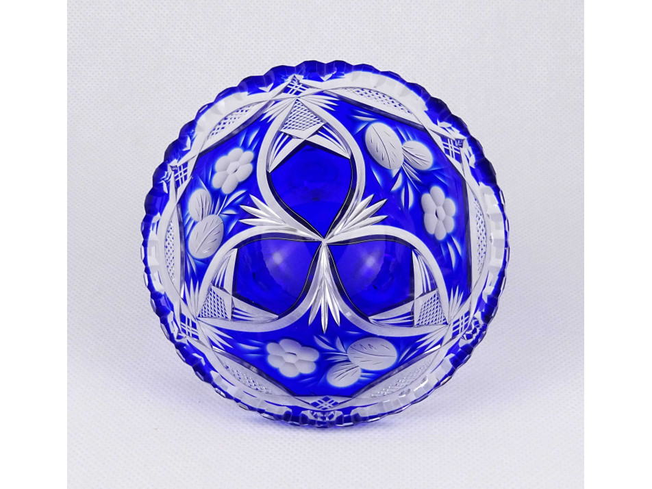 Kisméretű csigalábakon álló kék csiszolt kristály tálka
