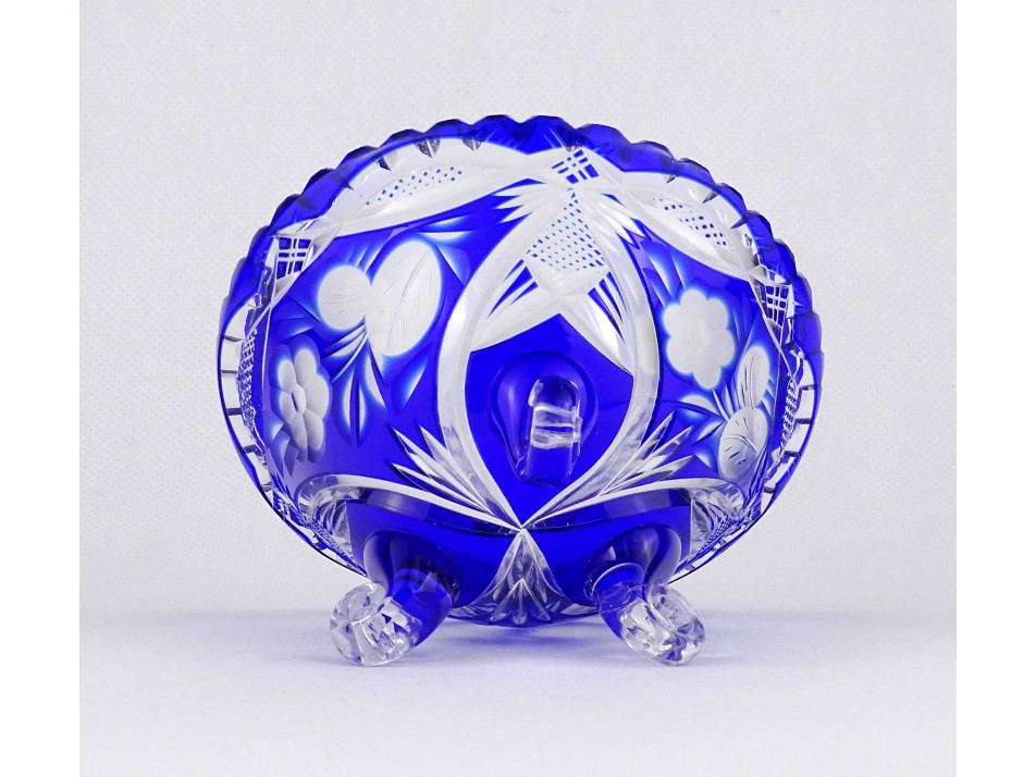 Hibátlan állapotú, kisméretű, csiszolatokkal gazdagon díszített, három csigalábon álló, kékre színezett kristály tál, tálka.