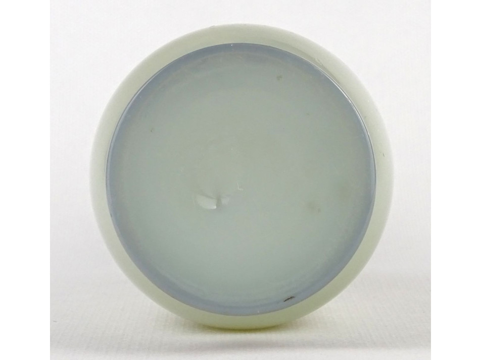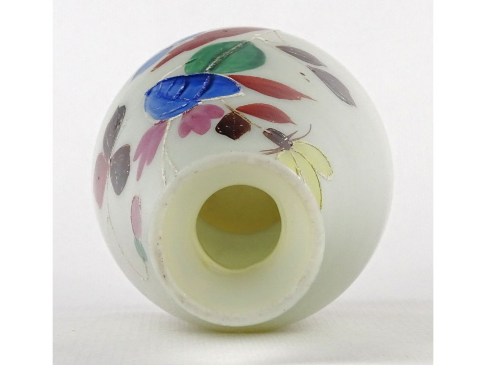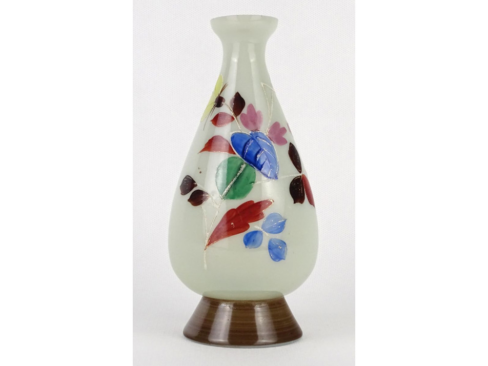 Hibátlan állapotú, színezett fúvott üveg váza, talpas art deco üveg váza, oldalán kézzel festettt motívumokkal díszítve. Talpán a fúvás szakítás nyoma szépen kivehető.
