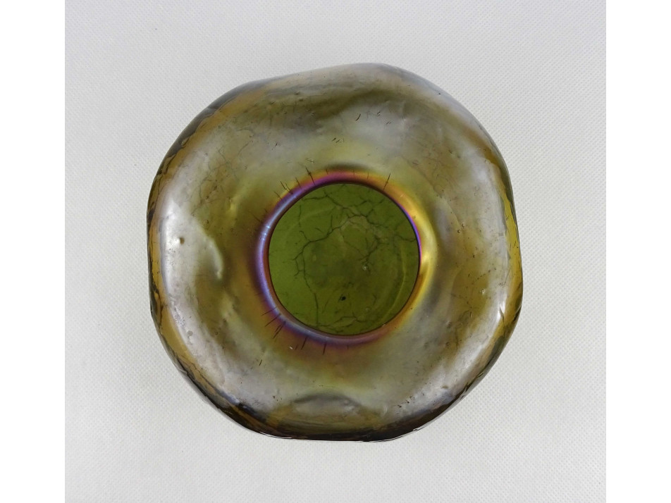 Hibátlan állapotú, gyönyörű, irizáló rétegelt kraklé, crackle, művészi üveg váza, design váza. Alján a fújás, szakítás nyomát csiszolással tüntették el.
