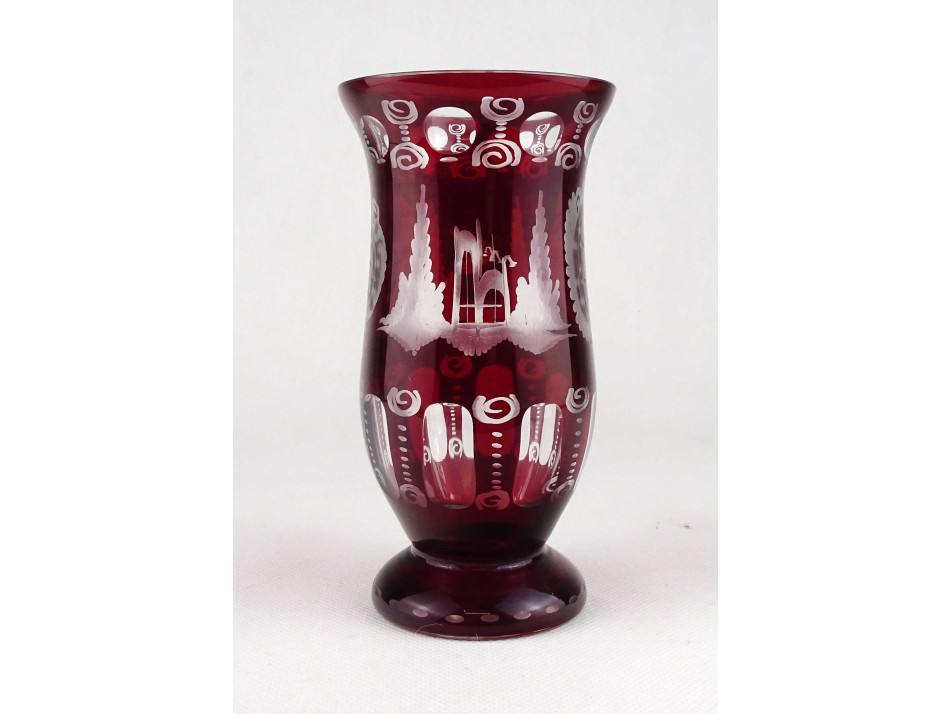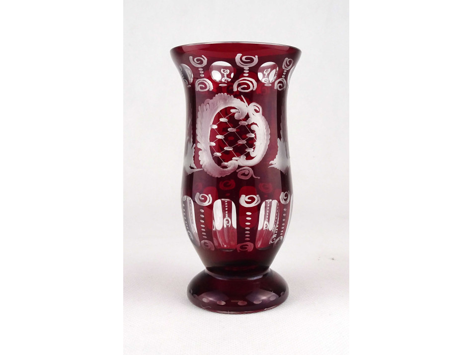 Antik, hibátlan állapotú, bíborpácolt Eggermann csiszolt üveg váza, díszváza. A váza teljes felülete finom csiszolatokkal díszített.