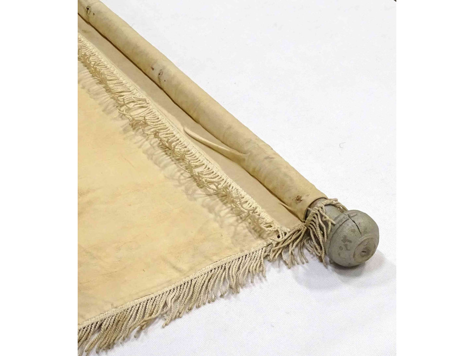 Antik XIX. századi világos templomi körmeneti zászló kétoldalán festett szentképekkel.