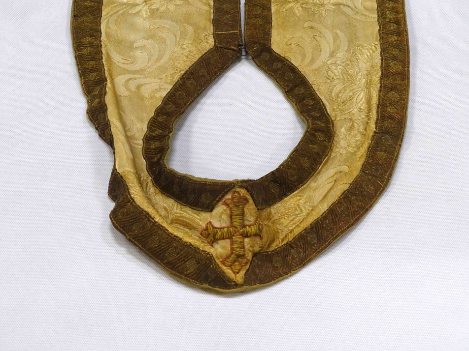 Antik, XIX. századi, szép állapotú, arany színű hímzett brokát Ortodox keresztény, papi stóla. Anyaga vastag arany brokátszövet, körben arany színű selyem brokát szalaggal szegve, két szárán három - három hímzett arany kereszttel díszítve. Alján kissé hiányos fémszálas rojtozás található.