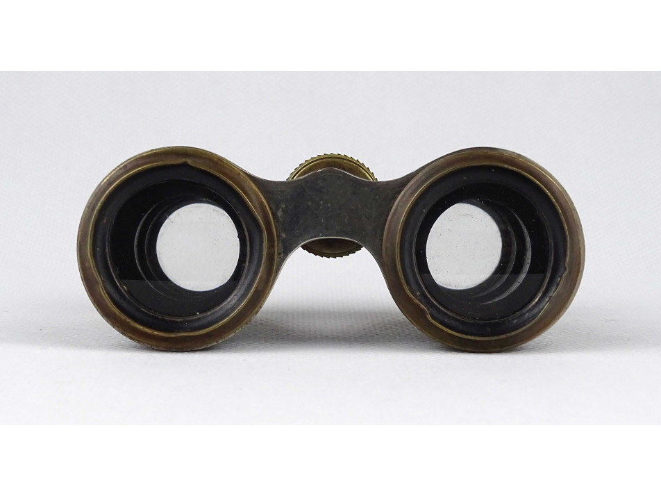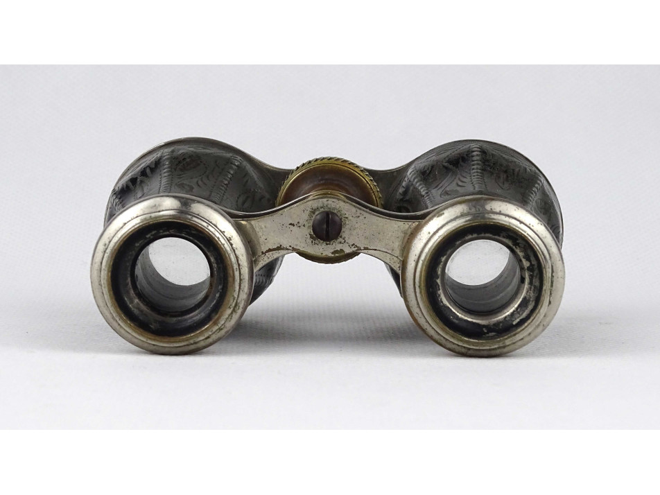 Antik, réz testű, díszes, domborított, ón lemezzel borított távcső, színházi látcső. Lencséi épek, felülete kopottas, patinás.