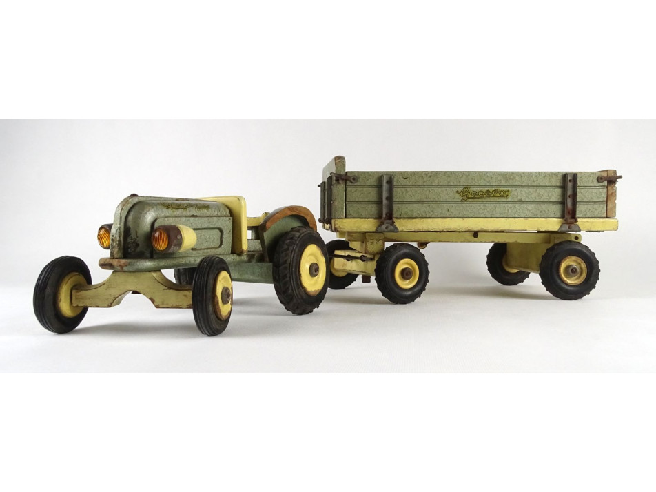 Nagyon régi, keletnémet, fából készült, szépen festett nagy méretű traktor, lecsatolható, billencs pótkocsi cca 1940-es, 1950-es évekből. Teljesen használható állapotban van. A traktor kormánya és egyik sárvédője hiányzik, a másik hiányos. A pótkocsi billenthető, oldalfalai lenyithatók.
