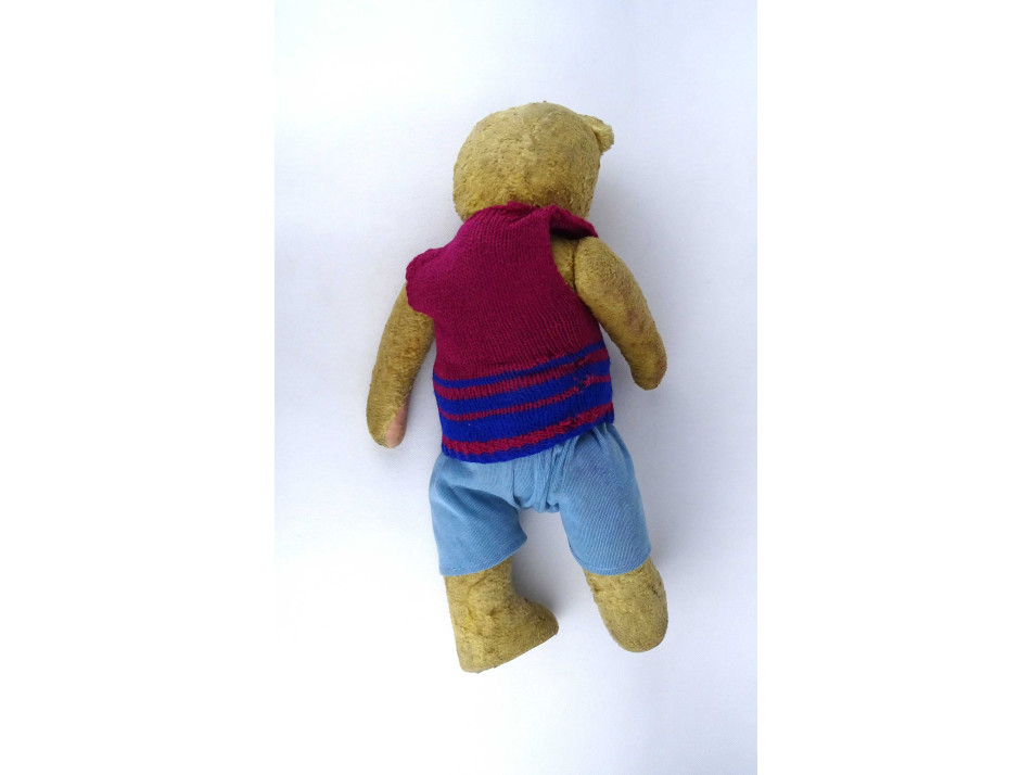 Nagyon régi, felöltöztetett füles mackó, szalmás mackó. A maci két karja, lábai és feje mozgatható, forgatható, szeme üveg.