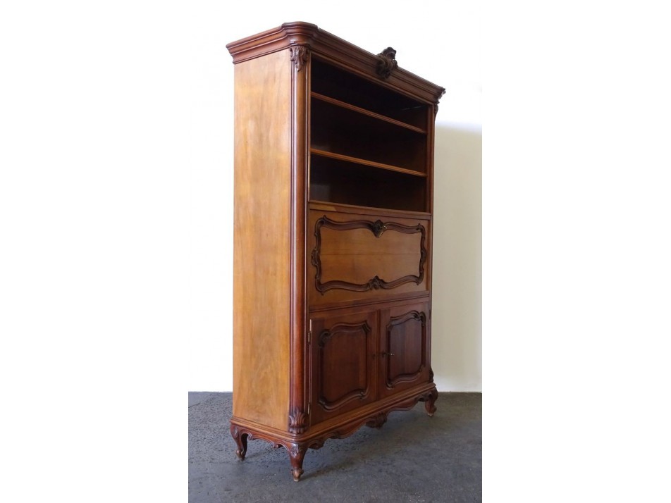 Gyönyörű, antik, faragványokkal gazdagon díszített nagy méretű könyvszekrény, írószekreter az 1800-as évekből. Középső részén lenyitható írófelület és tároló rész található A bútor szép állapotban van, azonnal enteriőrbe helyezhető.