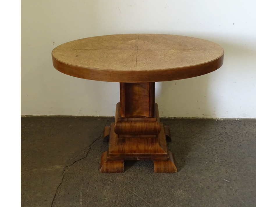 Antik art deco asztal, ovális alakú szalonasztal. Tetején parafaborítás található.