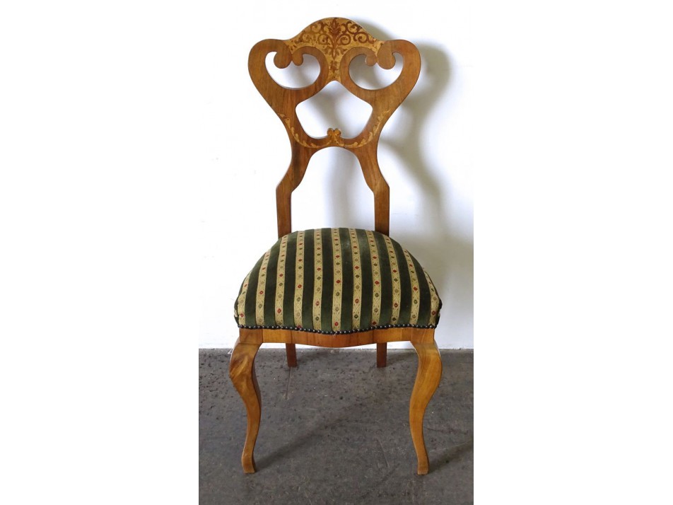 Hibátlan állapotú szép vastag svartnis Biedermeier szék, azonnal használatba vehető, enteriőrbe helyezhető állapotban van. Támláján gyönyörű intarzia díszítés. Ülőfelülete kényelmes epedarugós.