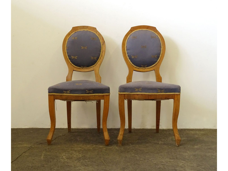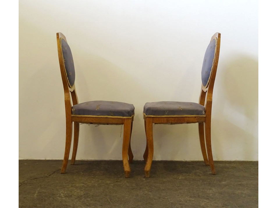 Szép állapotú, gyönyörű Biedermeier szék pár az 1800-as évek második feléből, cca 1880. Támlája és ülőfelülete kárpitozott. Rajta szitakötő mintás szürkéskék kárpittal.