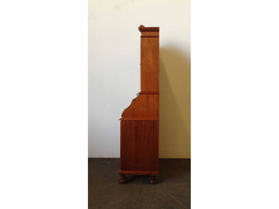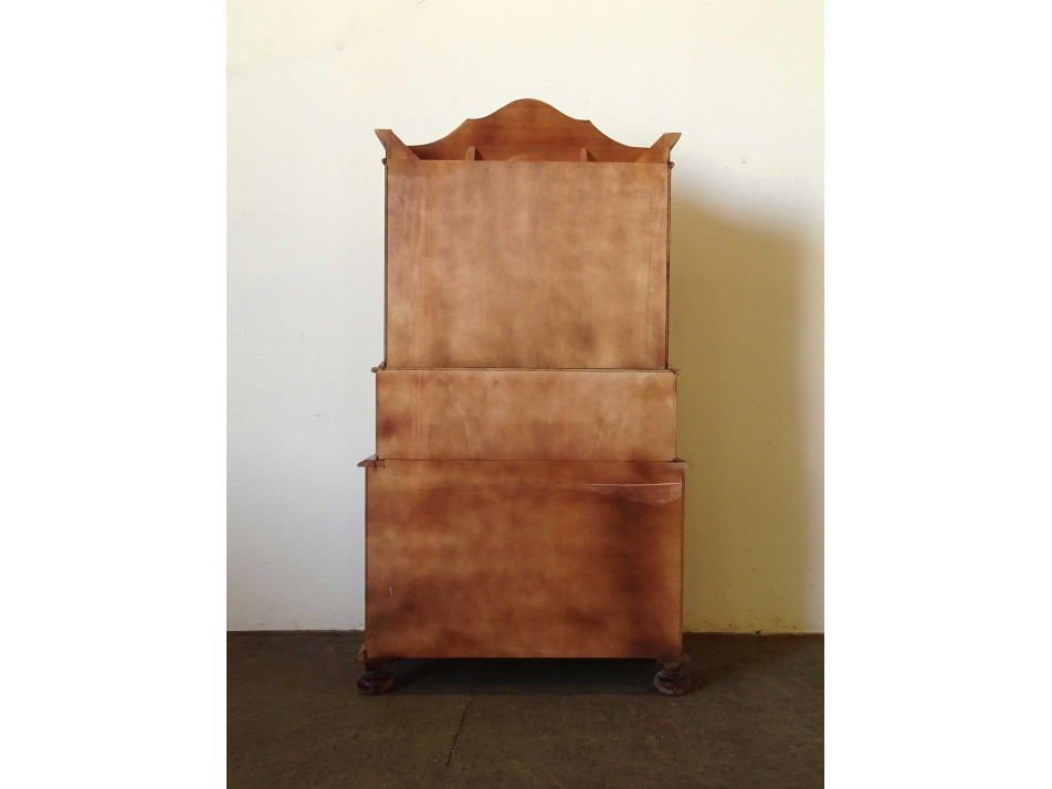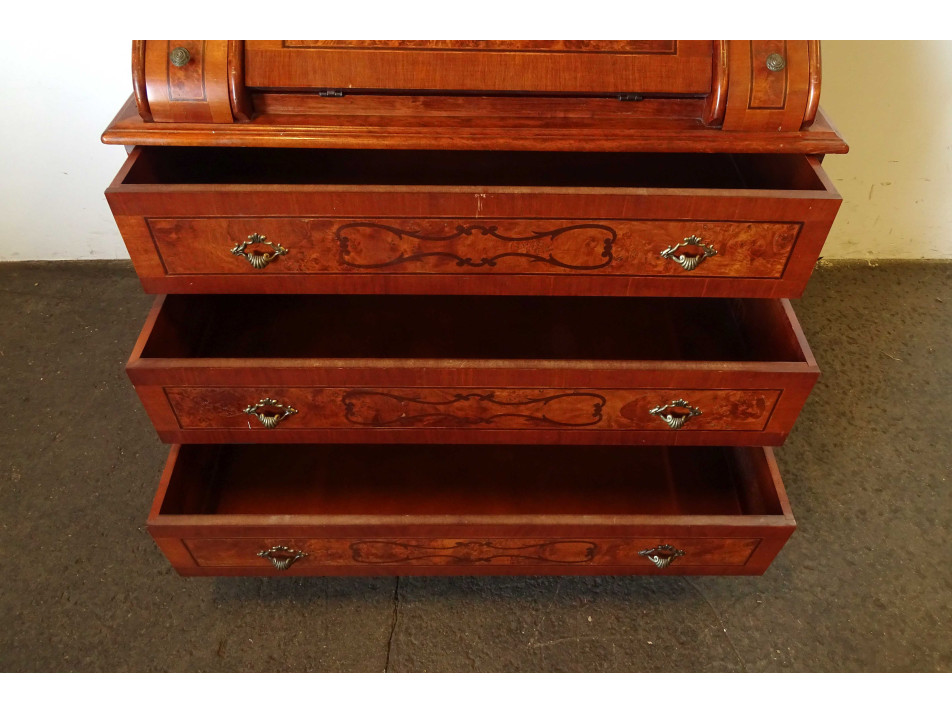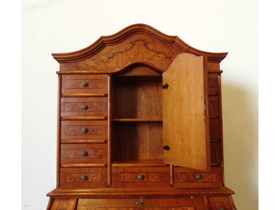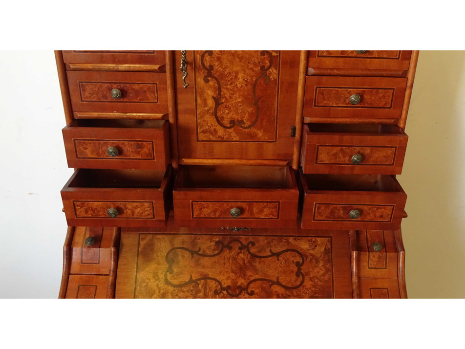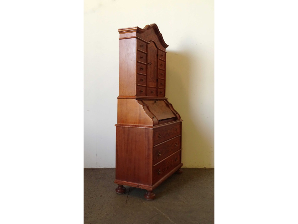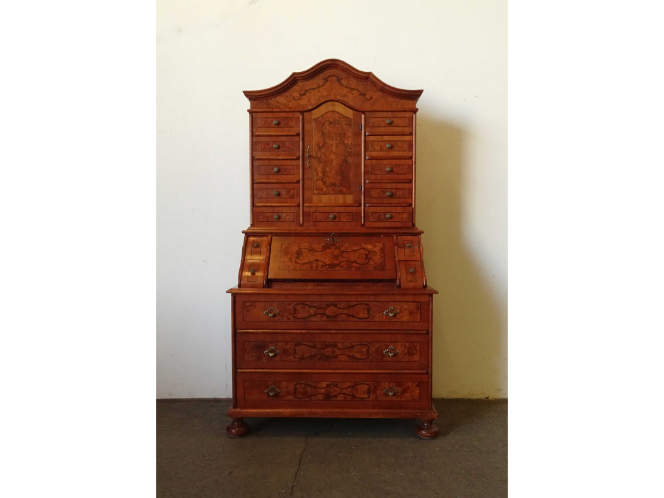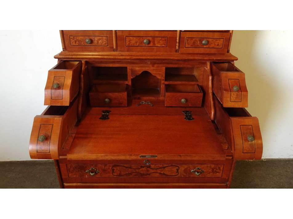 Biedermeier stílusú, intarziás szekreter, stilbútor, hibátlan állapotban,. Alul három fiók, felette lehajtható írófelület és tároló rész, mellette még négy fiók található. A felső részen oldalt 5 - 5 kisfiók, középen egy egyajtós kisszekrény, alatta még egy kisfiók található. Az egyajtós szekrényrész egy polccal tagolt.