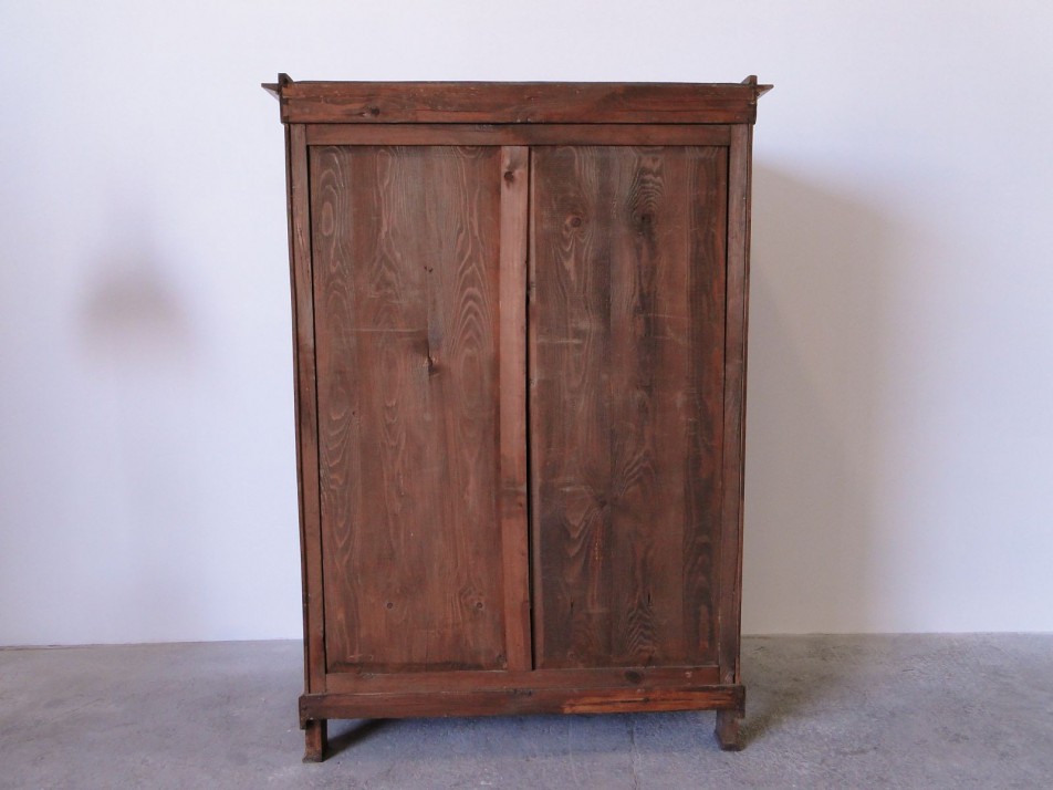 Nagyon régi, felújítatlan, szép állapotában lévő Biedermeier akasztós ruhásszekrény 1 db polccal. Oszlopain gyönyörű furnér intarzia található.