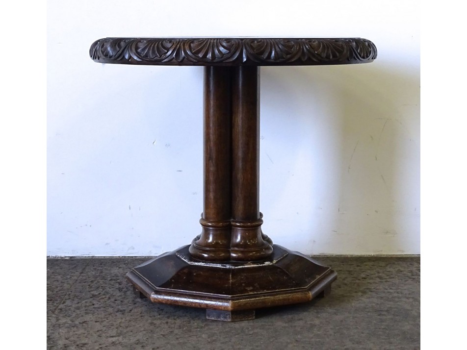 Antik, gazdagon faragott középen négyoszlopos körasztal, szalonasztal. Kissé kopottas, lásd fotó.